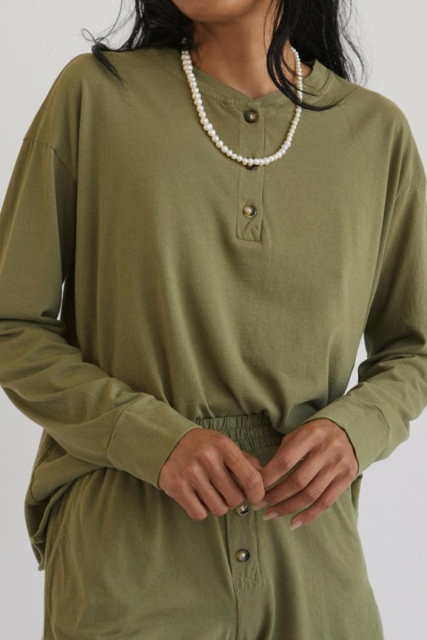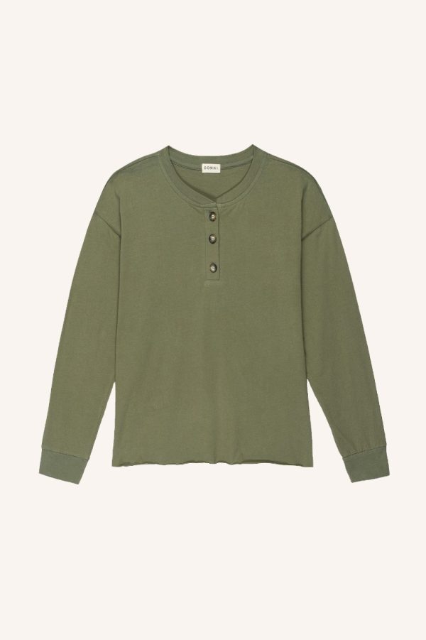 cotton henley long sleeve tee with tortoise button accent