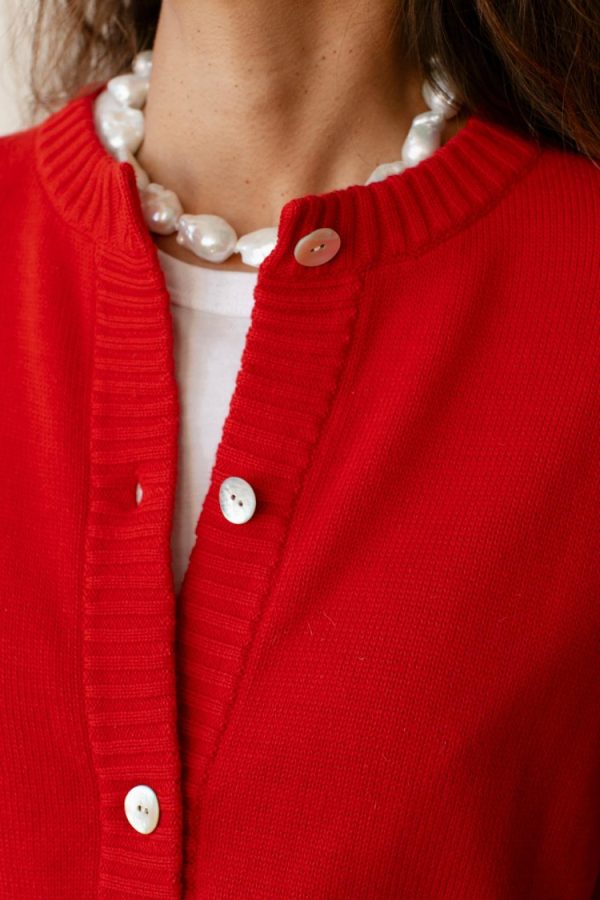 The Cotton Knit Cardigan is crafted with 100% Organic Cotton, featuring a slightly oversized fit, mother of pearl buttons and ribbed edges.