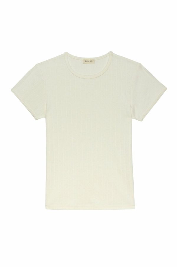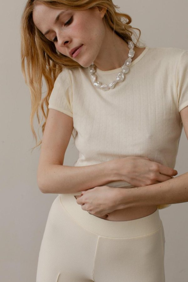 The Pointelle Baby Tee is crafted with 100% Organic Cotton, featuring a slim-fit, crewneck, and cap sleeves.